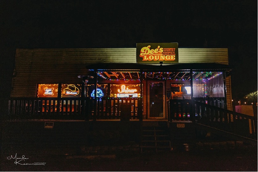 Stepping into Dee’s Country Cocktail Lounge feels like walking into a 1970s movie set. Housed in a converted triple-wide trailer, the wood-paneled space is lit by neon beer signs, string lights, and a tasteful disco ball. The decor is packed with character, featuring gold tinsel backdrops, a taxidermy bobcat, and iconic country music photography.