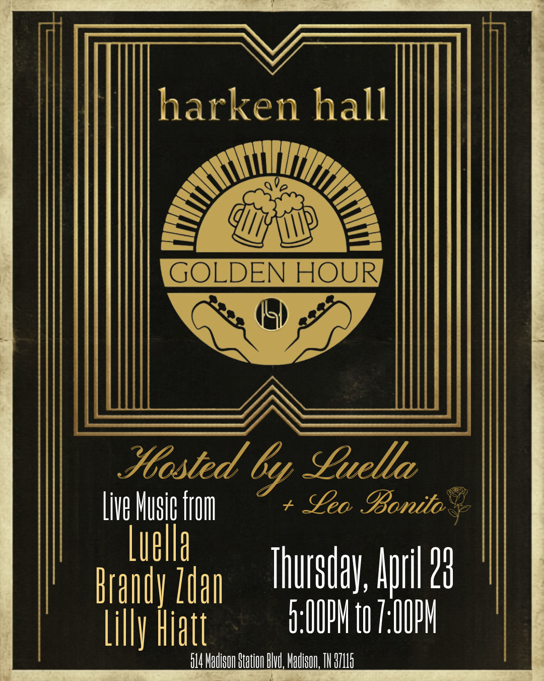 Join us every Thursday from 5pm–7pm (unless there’s a scheduled show) in the Harken Hall lobby for an early evening hang that feels as good as it sounds. Hosted by Luella, Golden Hour regularly features live performances from her along with a rotating lineup of talented guest artists.