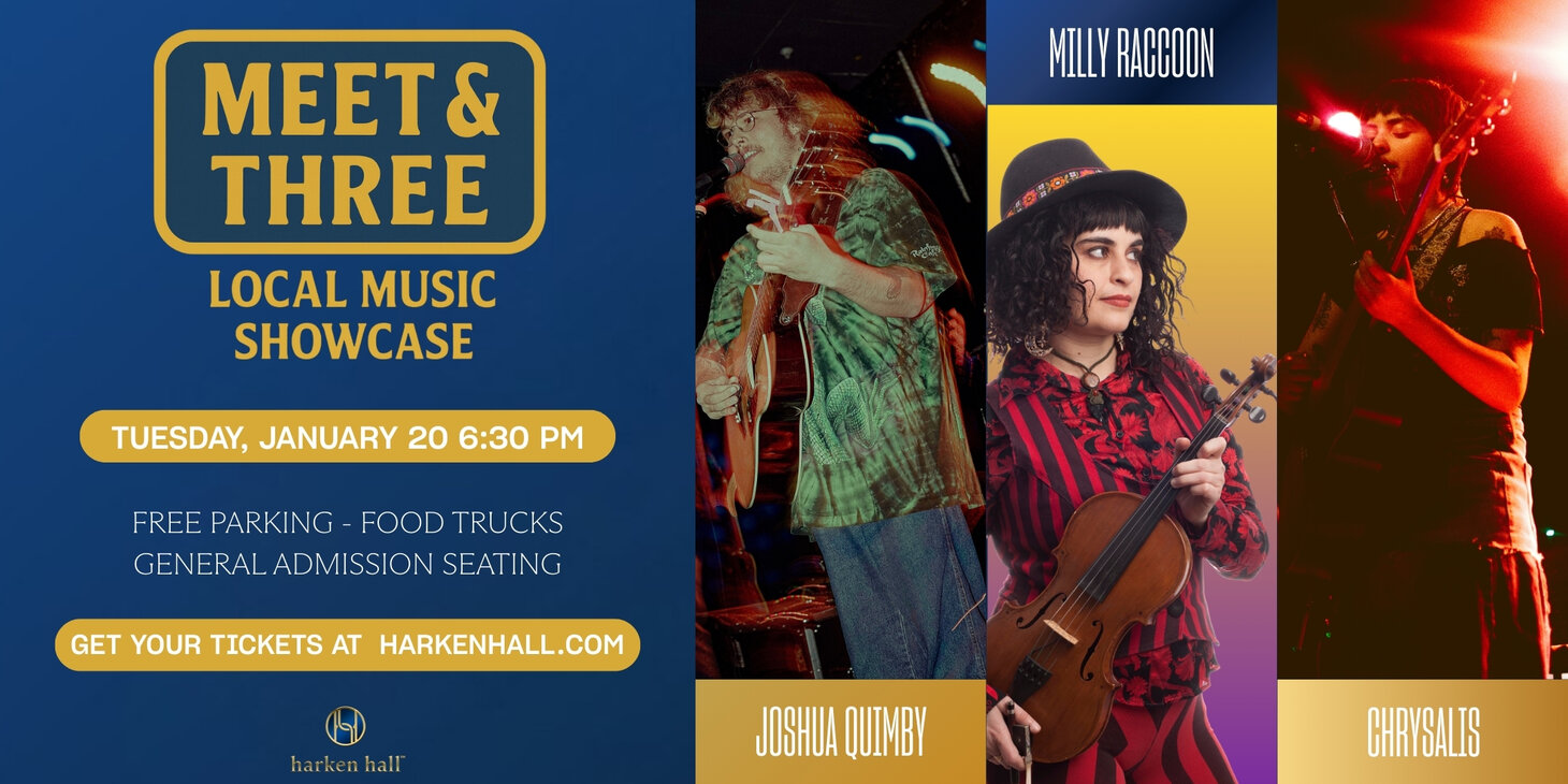 Join us at Harken Hall on Tuesday, January 20 for the latest installment of Meet & Three Local Music Showcase — where at least three local artists take the stage each night for an evening of music and community.