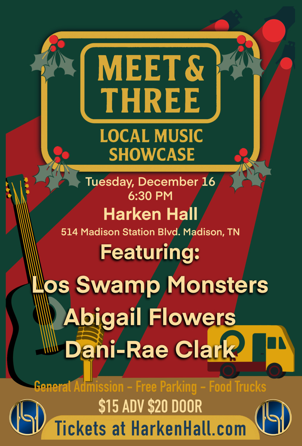 Join us at Harken Hall on Tuesday, December 16 for the latest installment of Meet & Three Local Music Showcase — where at least three local artists take the stage each night for an evening of music and community.